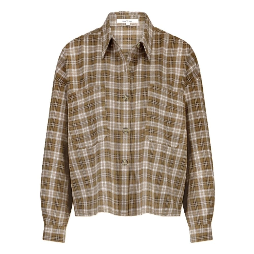 De knoopsluiting en handige borstzakken maken de blouse functioneel en afwisselend te dragen. Het warme bruine kleurenschema met een subtiel, licht ruitpatroon geeft de blouse een stijlvolle uitstraling die makkelijk te combineren is met zowel jeans als een stoere broek.