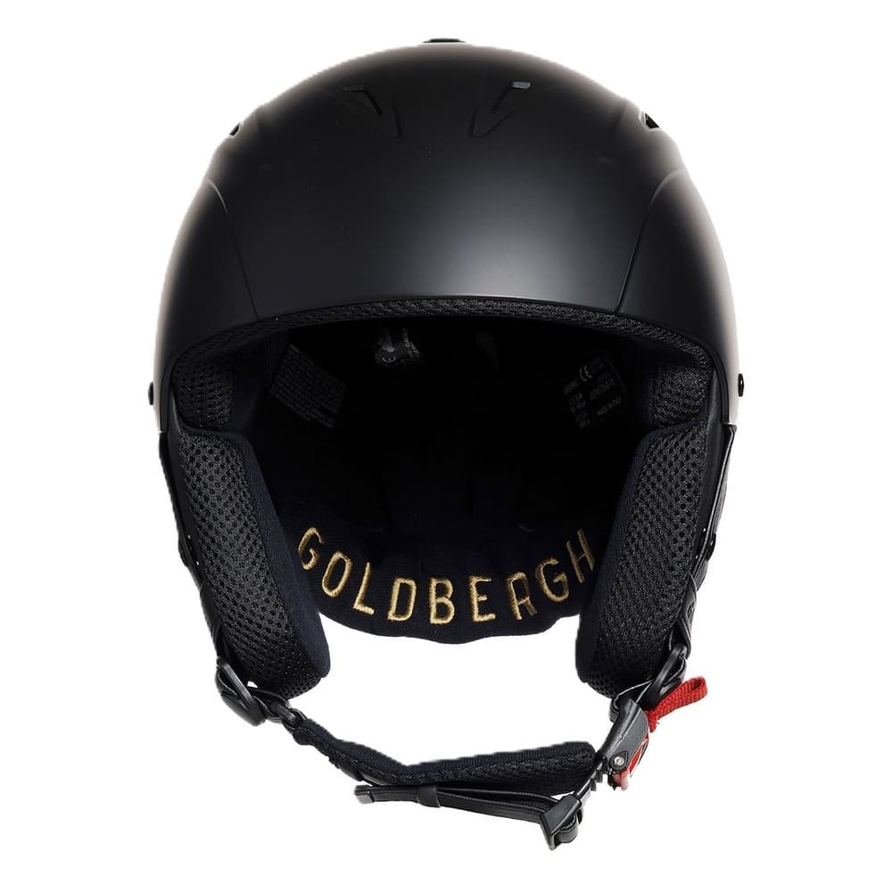 Voor extra gemak is de helm uitgerust met een goggle strap holder en wordt geleverd met een bijpassende reistas en beschermende verpakking. De faux leren oorbeschermers zijn subtiel gemerkt met het Goldbergh-logo, terwijl de binnenzijde van de helm is voorzien van een gouden borduursel, wat bijdraagt aan de premium uitstraling.