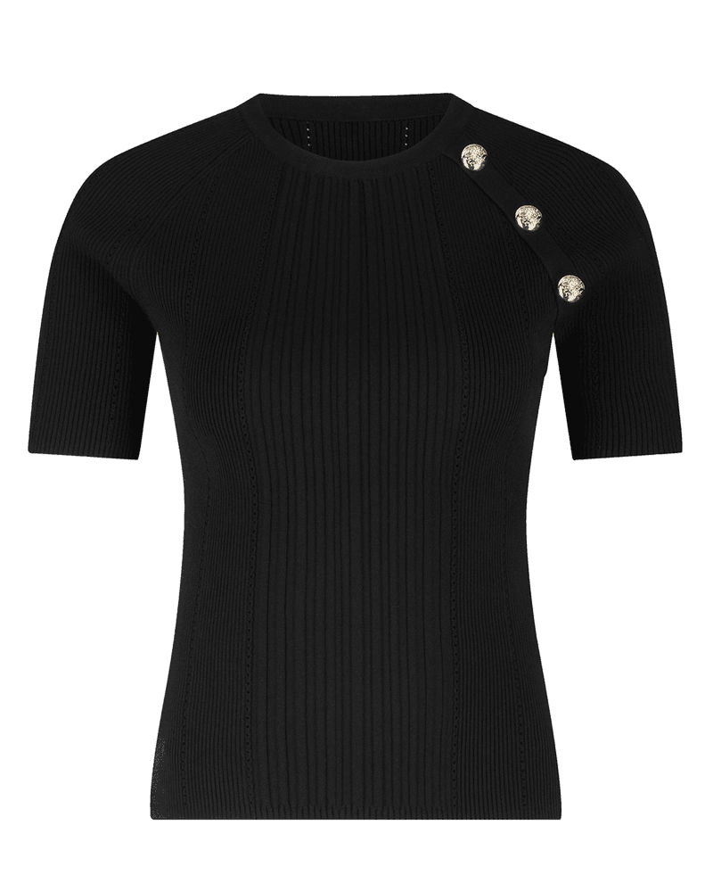 Subtiele knoopdetails voegen een verfijnd accent toe, terwijl de regular fit zorgt voor een comfortabele pasvorm die moeiteloos te combineren is met jeans, rokken of pantalons. Dankzij het effen design is deze top een echte basis die je eindeloos kunt stylen. Het model is 174cm en draagt een 36.