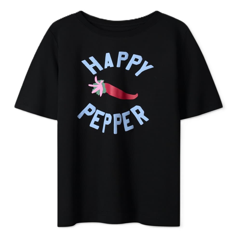 Breng pit in je garderobe met het Garden Pepper T-shirt van POM Amsterdam. Dit zwarte shirt met kleurrijke opdruk is allesbehalve saai. De speelse illustratie van een chilipeper gecombineerd met de vrolijke tekst “Happy Pepper” maakt dit item perfect voor wie graag een knipoog aan haar outfit toevoegt.