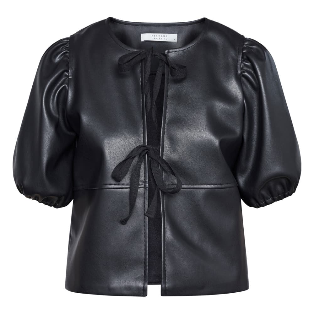 De NELL striktop van Sisters Point in het zwart is de perfecte mix van stoer en vrouwelijk. De top is gemaakt van een soepel vallend faux leather materiaal dat direct een edgy uitstraling geeft, terwijl de korte pofmouwen en de striksluiting aan de voorkant zorgen voor een speels en verleidelijk effect.