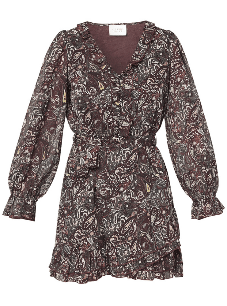 Deze korte jurk heeft een all-over paisley patroon in bordeaux, wat zorgt voor een tijdloze en elegante look. De lange mouwen met subtiele elastische boorden dragen bij aan het romantische karakter van de jurk.
