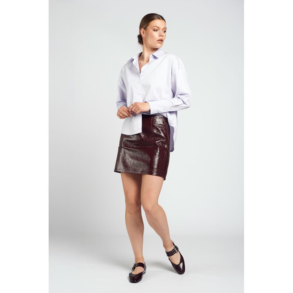 De Thalie Skirt van Spooq The Label is een echte eyecatcher voor een moderne, city-chic look. De diepe bordeauxrode kleur en de glanzende laklook met subtiele crackle-finish geven de rok een unieke, statement-making uitstraling.