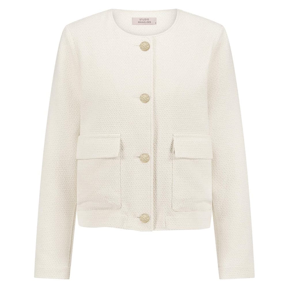 Het Berber Tweed Jacket in Kit van Studio Anneloes is een tijdloos statement piece met een moderne twist. De luxe tweedstof heeft een subtiele glans, wat het jasje een elegante en verfijnde uitstraling geeft. Dankzij de regular fit creëert het een stijlvol silhouet, terwijl de gouden knopen en 3D-klepzakken zorgen voor een extra chic detail.